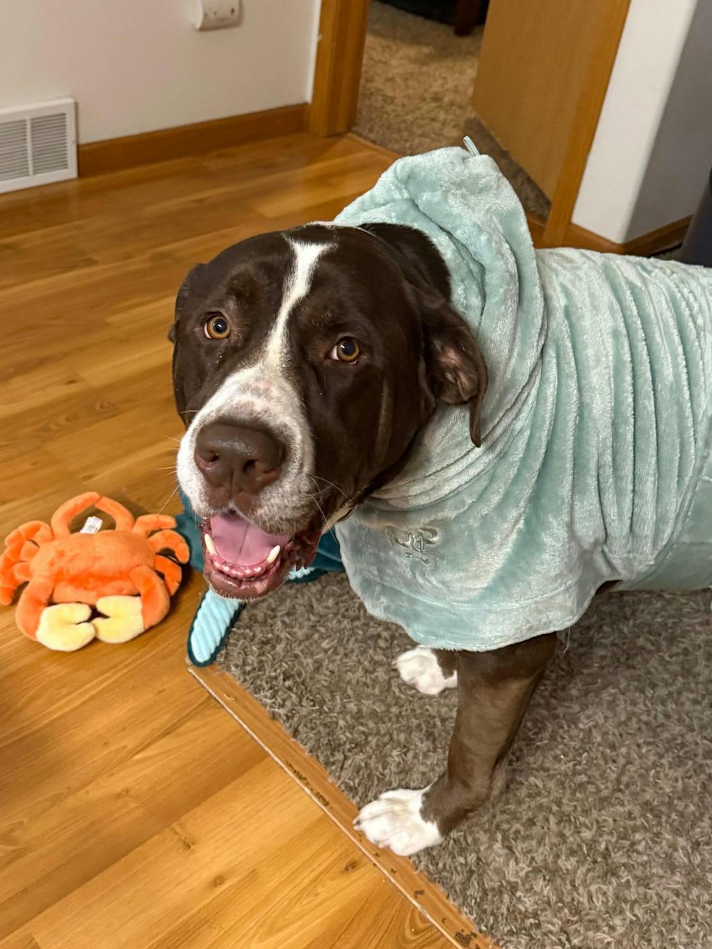 - Dog robe has wrap fit with adjustable belly strap and no arm holes